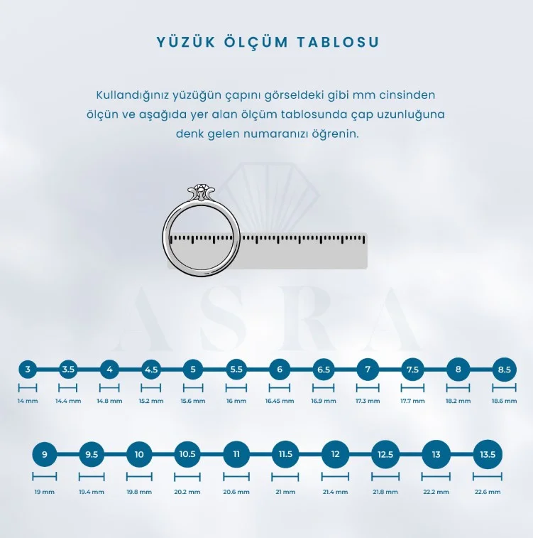 Yüzük ölçü tablosu tıpkı ülkelerin bedenleri gibi değişkendir. Türkiye’de kullanılan ölçüler ile Amerika’da kullanılan ölçüler aynı değildir. Türkiye’de Avrupa’da kullanılan yüzük ölçüsü tablosu kullanılır. Örneğin 7 cm parmak yüzük ölçüsü Türkiye’de 15 mm çap, 47 mm çevre uzunluğuna denk gelirken Amerika’da 4 numaraya karşılık gelir. Ürün satın almadan önce ölçü tablolarına göre atarak parmağınızın bedenini kolaylıkla öğrenebilirsiniz.